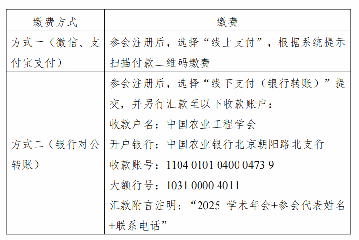 仅参加中国农业工程学会第十二次会员代表大会、中国农业工程学会工作会和《农业工程学报》编委会会议暨创刊40周年座谈会的代表,不必缴纳年会注册费。