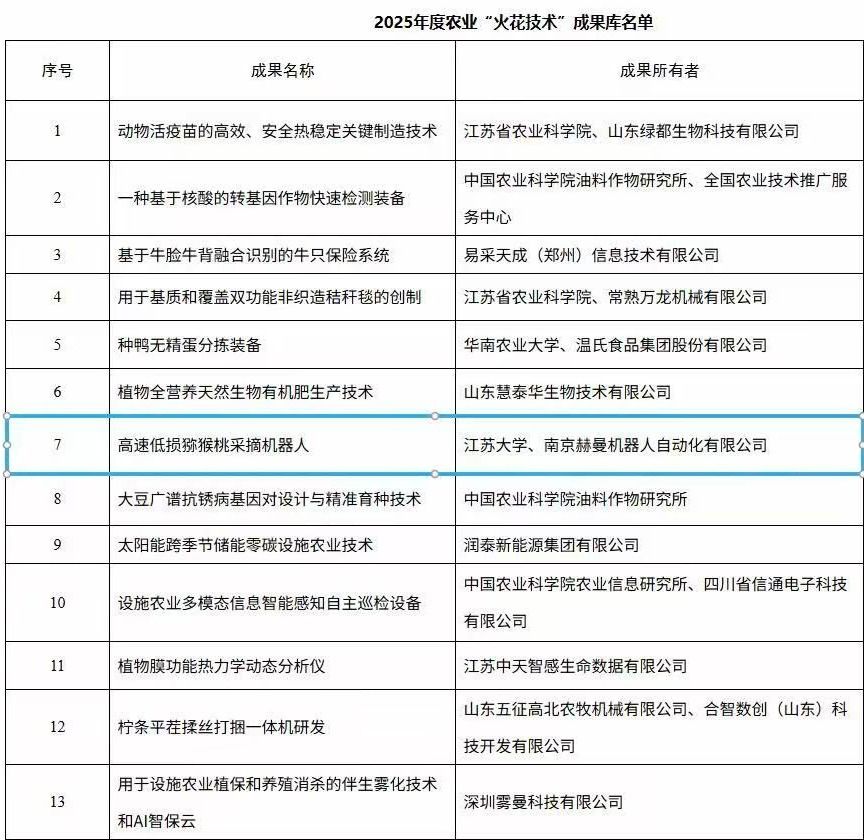 近日,农业农村部科学技术司发布了2025年度农业“火花技术”成果库名单,由江苏大学农业工程学部农业机器人方向负责人、国家数字农业装备(人工智能和农业机器人)创新分中心首席专家、农业工程学院教授刘继展牵头申报的“高速低损猕猴桃采摘机器人”技术成功入选,成为全国仅30项入库成果之一,这一成果标志着江苏大学在农业智能装备领域取得重要突破,进一步彰显了学校在服务国家乡村振兴战略中的科研实力与创新能力。