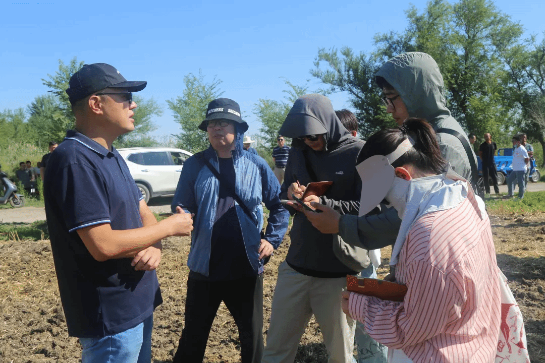 7月23日,在新型国产重型圆盘耙试验现场,项目负责人、江苏大学教授郭顺(左一)向职工介绍圆盘耙作业效能。兵团日报全媒体记者 兰玲玲 实习记者 纪晓贞 摄